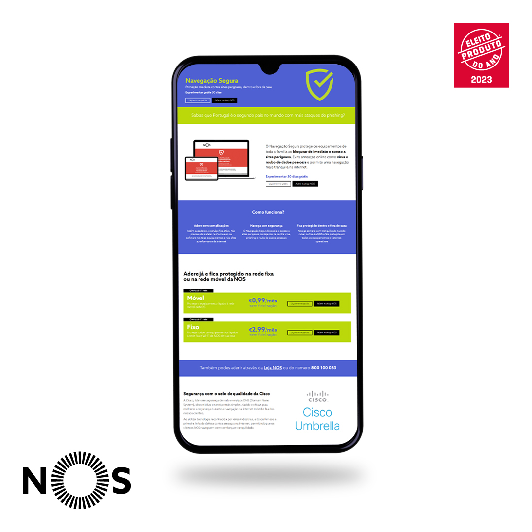 Atualmente quase tudo o que fazemos é digital: fazemos compras, exercício, trabalhamos, socializamos e relaxamos através da internet. E o facto de estarmos cada vez mais ligados, torna-nos também mais suscetíveis a ciberataques. Isto faz com que o papel da NOS não passe apenas por disponibilizar a melhor internet, mas também a mais segura. Para ajudarmos os nossos consumidores a protegerem as suas vidas digitais, lançámos em 2022 o Navegação Segura. Este serviço é a primeira linha de defesa contra ameaças online e consiste numa solução de segurança na rede disponibilizada em parceira com a Cisco, que bloqueia o acesso a sites perigosos, protegendo o consumidor contra ciberataques como phishing e malware. O Navegação Segura é o primeiro serviço em Portugal que oferece proteção tanto na rede móvel como na rede fixa, protegendo assim todos os equipamentos que estão ligados à rede da NOS durante a navegação na internet.